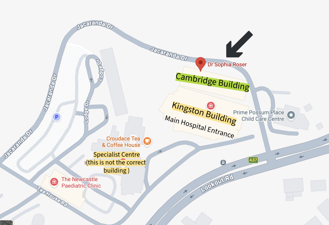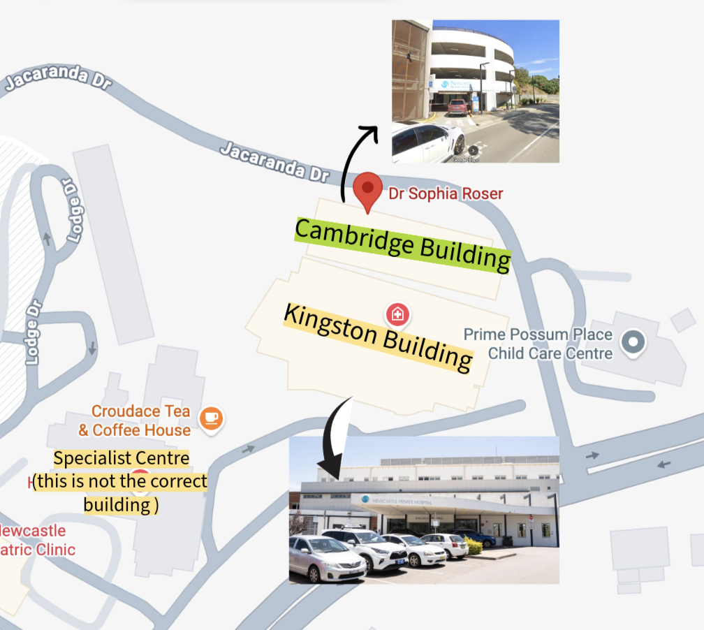 Newcastle Private is made up of a series of buildings. Dr Roser’s rooms are located within the main building of Newcastle Private Hospital (in the Cambridge Building). The rooms are NOT located in the Specialist Suite building. The map below shows where these buildings are on campus.